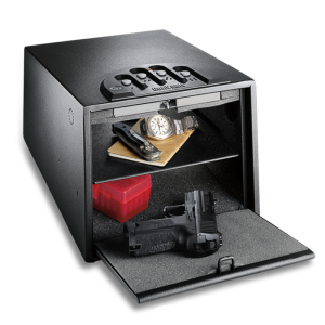 - GunVault MiniVault GV1000DLX w/ Electronic Pushbutton Lock, Tamper Indicator